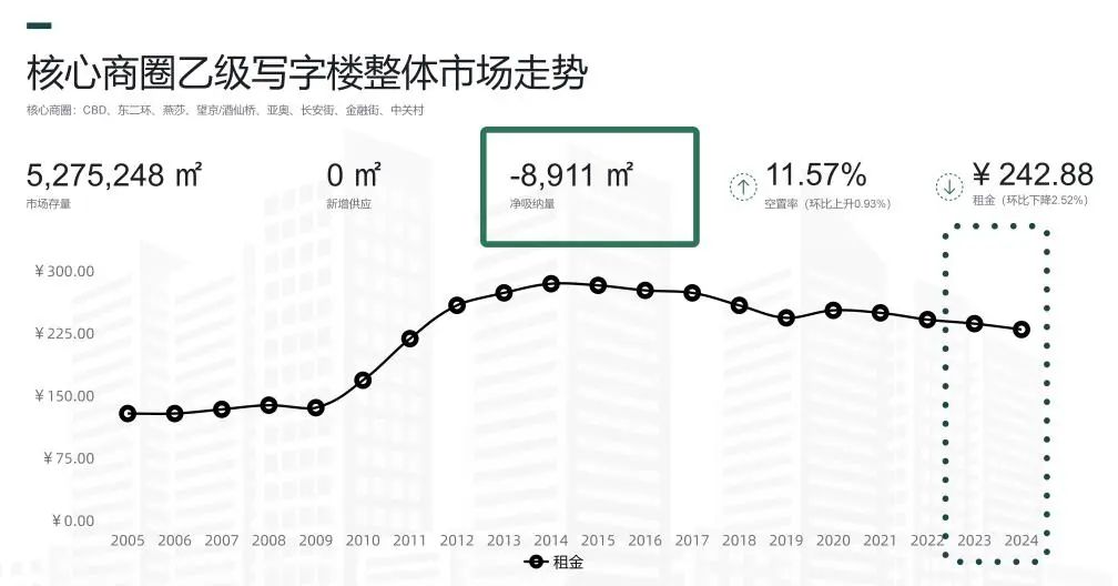 核心商圈整體乙級寫字樓凈吸納量為-8,911平方米。空置率受部分樓宇租戶退租影響,上升0.93個百分點至11.57%。租金呈現明顯的下降趨勢,環比上季度降低2.52個百分點至每平方米每月242.88元。其中中關村、金融街商圈租金環比下降3.9和3.5個百分點;望京/酒仙橋和亞奧商圈租金環比下降2.8個百分點。