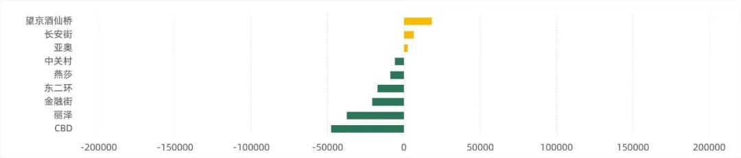 從各主要商圈成交面積環(huán)比變化來看,望京酒仙橋、長(zhǎng)安街、亞奧商圈本季度成交面積有所增長(zhǎng),其他商圈成交面積環(huán)比上季度均呈現(xiàn)不同程度降低,其中CBD商圈降幅最為顯著。