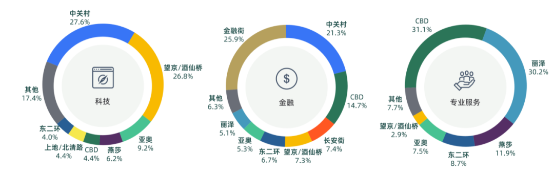 2022年第四季度科技行業(yè)在中關(guān)村、望京酒仙橋商圈成交面積占比顯著,占比超過全市的五成,亞奧、燕莎等商圈也有該類企業(yè)落位。