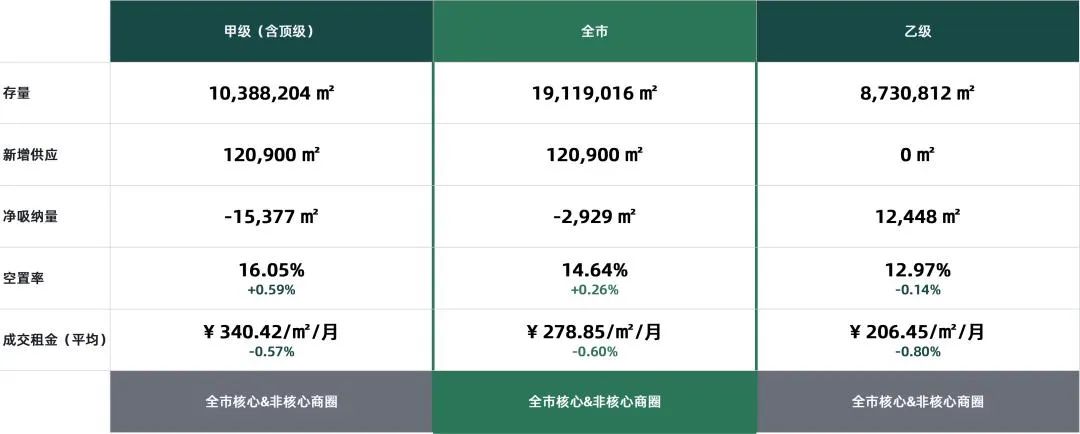 本季度頂級(jí)、甲級(jí)寫字樓成交面積環(huán)比上季度均有所降低;其中甲級(jí)寫字樓成交面積降幅超過16萬平方米,乙級(jí)寫字樓成交面積逆勢(shì)增長(zhǎng)。