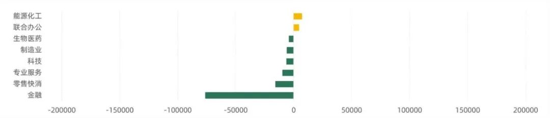 從行業(yè)成交面積環(huán)比變化來看,科技、金融行業(yè)本季度成交面積環(huán)比上季度降低共超9萬平方米,成交數(shù)量降幅分別為34.78%和30.43%,表現(xiàn)較為低迷;僅能源化工及聯(lián)合辦公行業(yè)成交面積環(huán)比上季度有所上升。