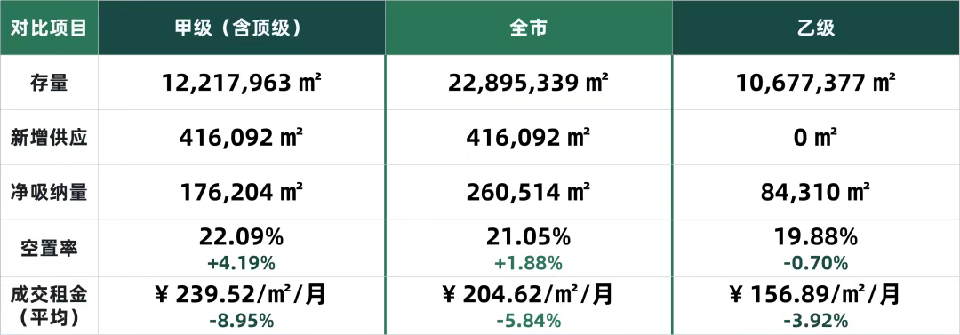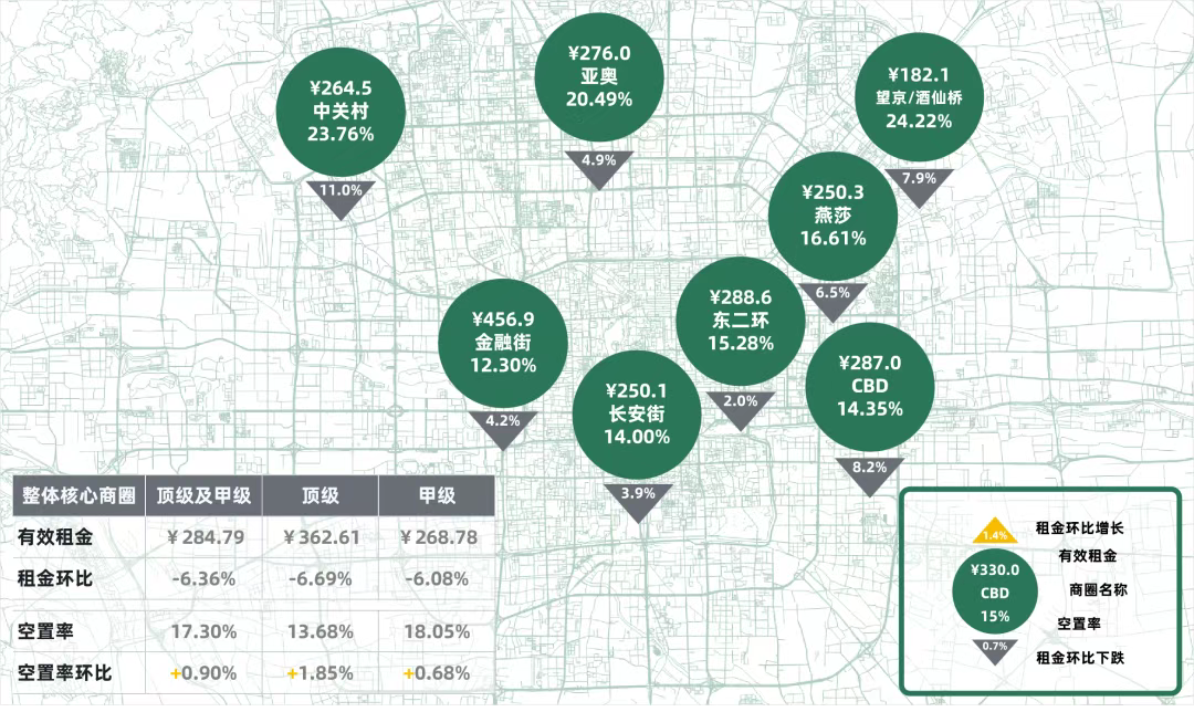 本季度核心商圈甲級(含頂級)寫字樓凈吸納量為122,135平方米,空置率環比上升0.90個百分點,錄得17.30%;成交租金受持續加劇的市場競爭影響,不斷下行,環比上季度下降6.36個百分點,為每月每平方米284.79元。