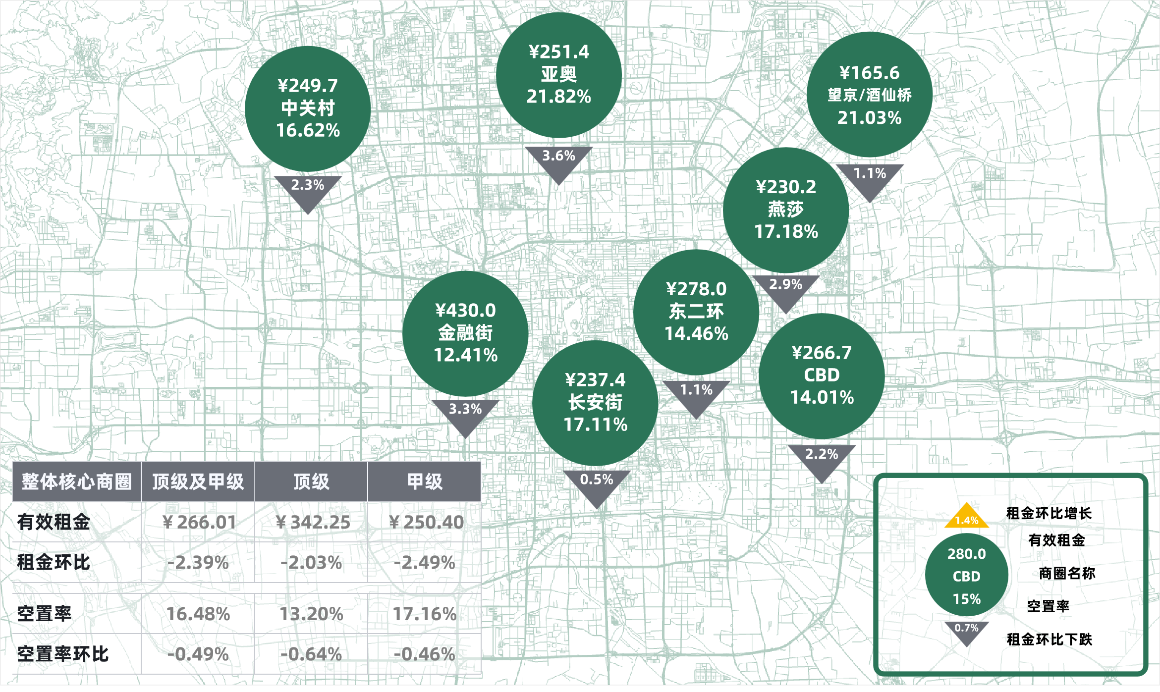 本季度核心商圈甲級(jí)(含頂級(jí))寫字樓凈吸納量為45,260平方米,空置率環(huán)比下降0.49個(gè)百分點(diǎn),錄得16.48%;成交租金延續(xù)下行,環(huán)比上季度下跌2.39個(gè)百分點(diǎn),為每月每平方米266.01元。